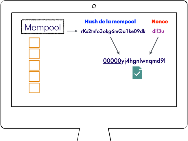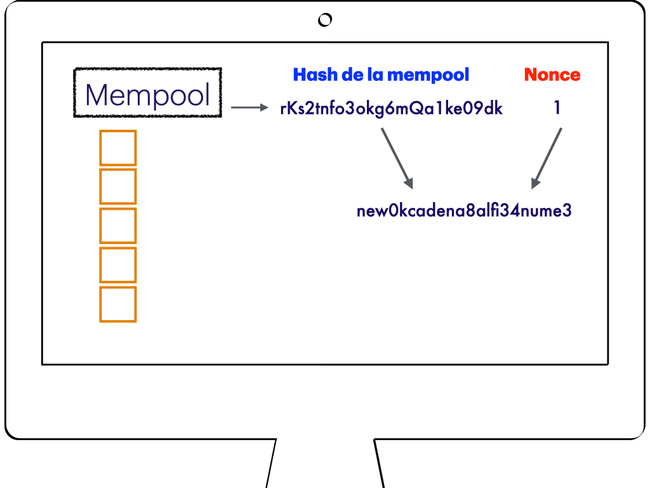 Un nodo puede condensar las transacciones de su mempool en una cadena de números y letras. Esta cadena alfanumérica es un hash