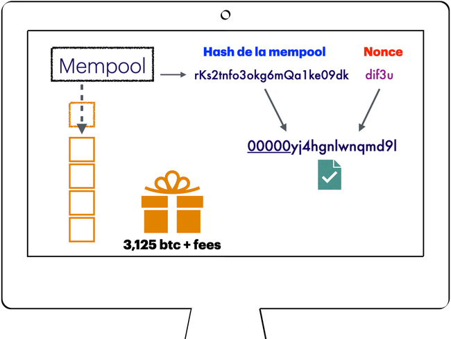 El ganador recibirá una recompensa en bloque (block reward) (que incluye una determinada cantidad de bitcoins y la tarifas (fee) de las transacciones que se hayan agregado a la blockchain).