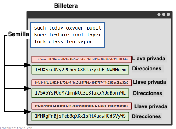 Esta semilla es UNICA y la genera aleatoriamente la billetera. Es la fuente de todas tus llaves y direcciones . Por lo tanto, te permite recuperar todos tus bitcoins si pierdes tu billetera por cualquier motivo.