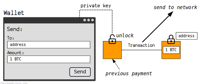 Cuando envías bitcoins a otra persona, tu billetera creará una nueva transacción que desbloquea una cantidad de bitcoins que has recibido usando la clave privada correspondiente y bloquea una cantidad de bitcoins en la dirección de otra persona.